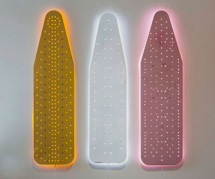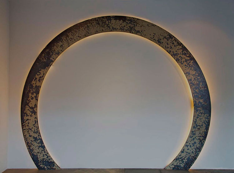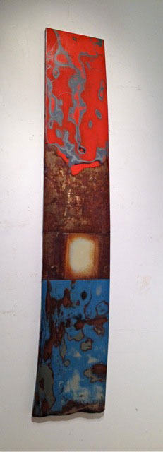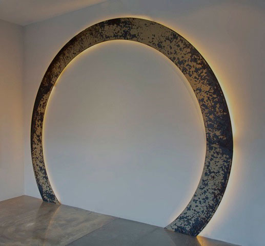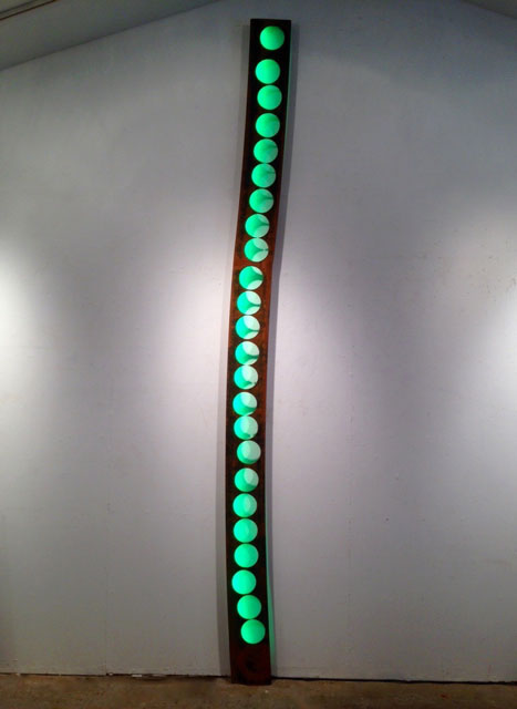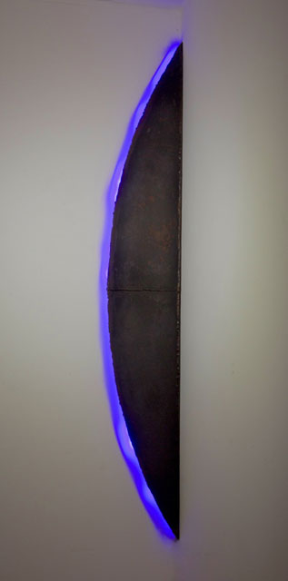 Found and fabricated steel, color changing light emitting diodes, remote control